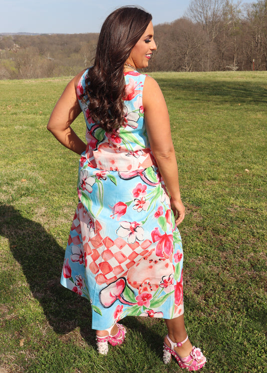 Cascading Bloom Midi Skirt Set - Coral and Aqua