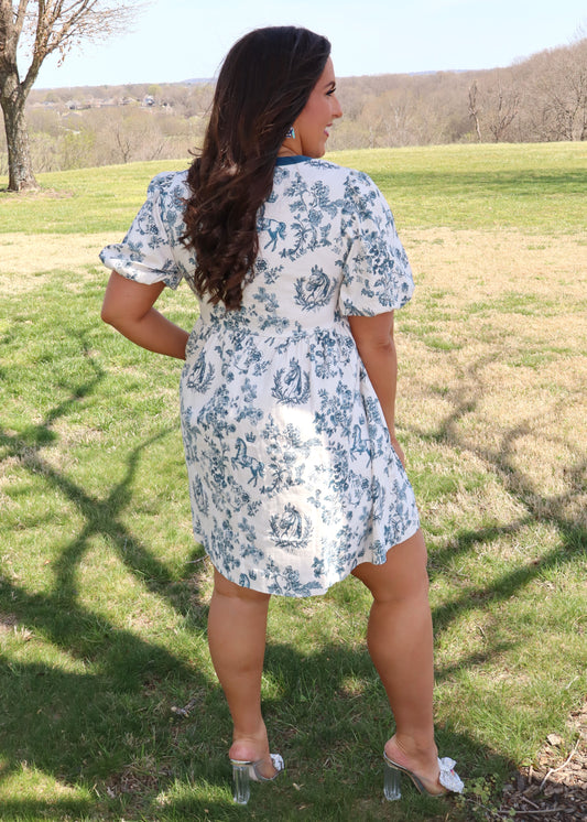 Vintage Horse Toile Print Short Dress - Navy/Off-White