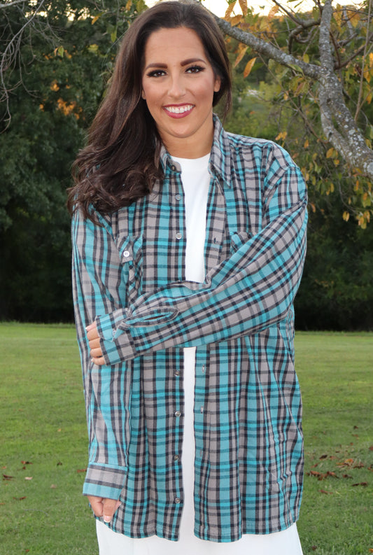 Plaid Crop Shirt Jacket - Teal/Brown Combo