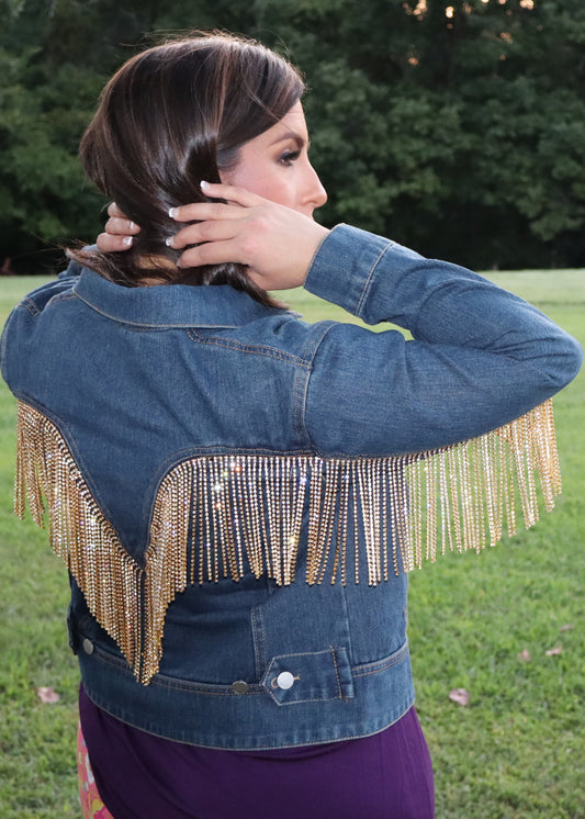 Gold Rhinestone Fringe Dark Denim Jean Jacket