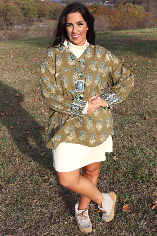 Peaceful Fields Button-Up Shirt - Olive Green with blue flowers