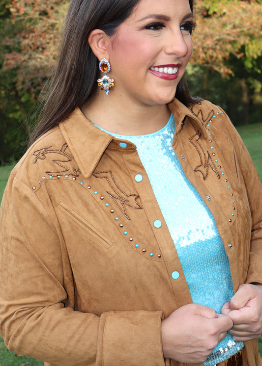 Suede Western Embellished Yoke Snap Up Blouse - Camel