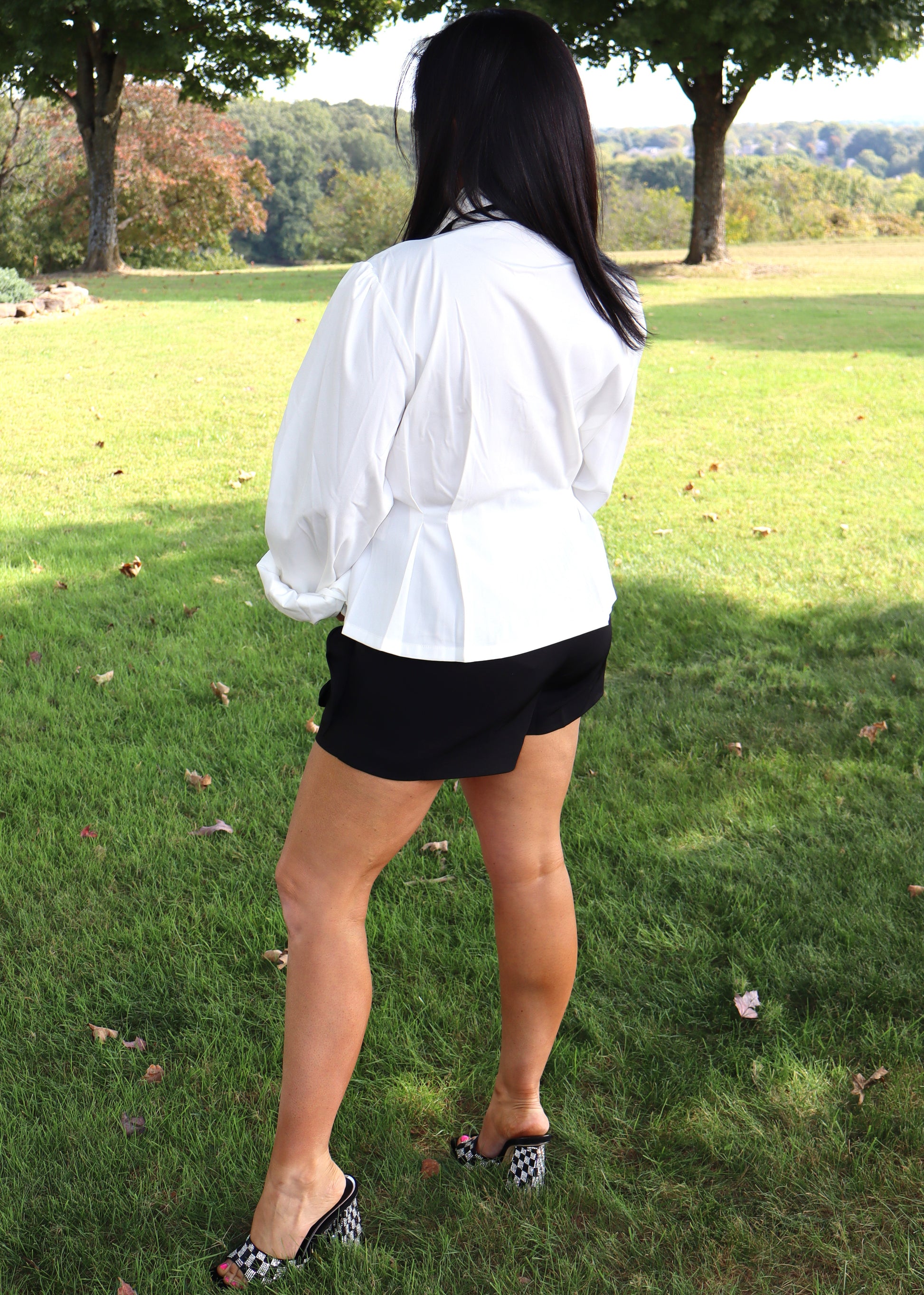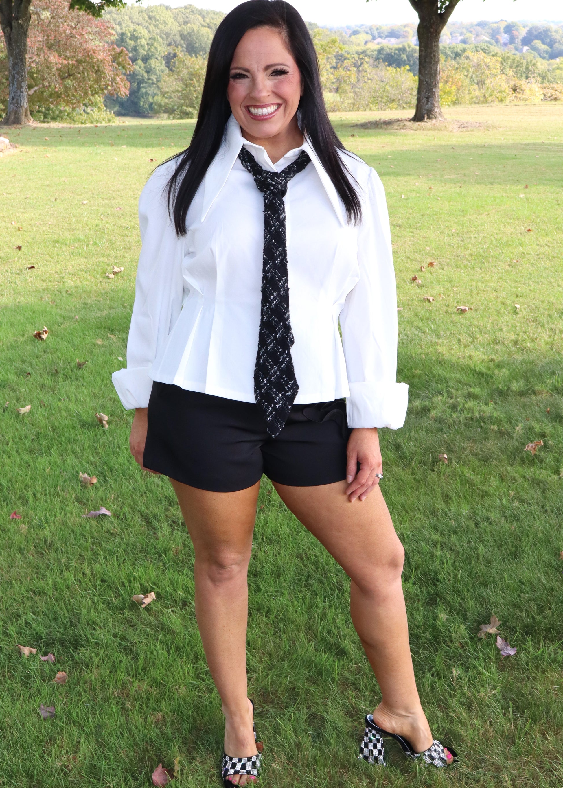 This top has all the details and more: peplum and exaggerated collar! The fabric has some stretch. The tweed tie comes with it, but it is not attached, so you can wear the shirt with or without the tie.