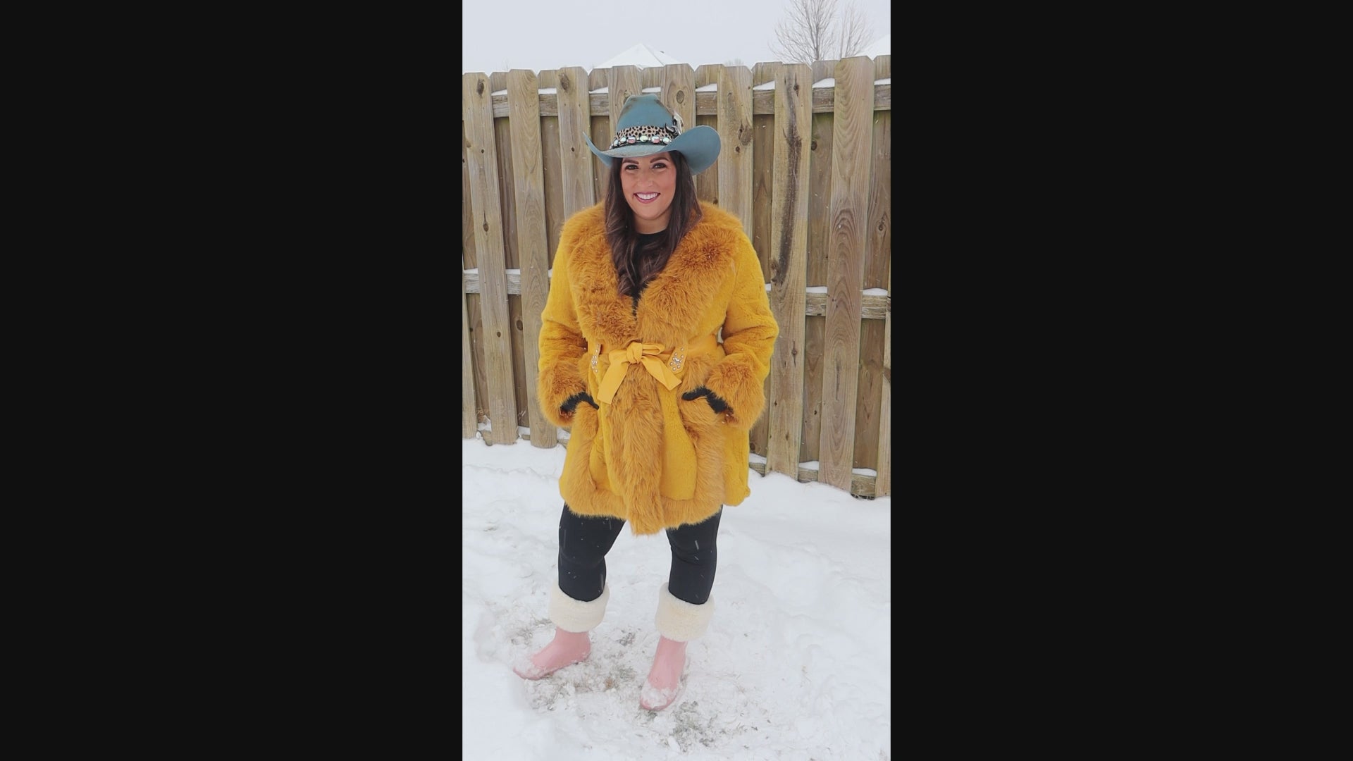 Jennifer is pictured wearing a size small/medium in this jacket.