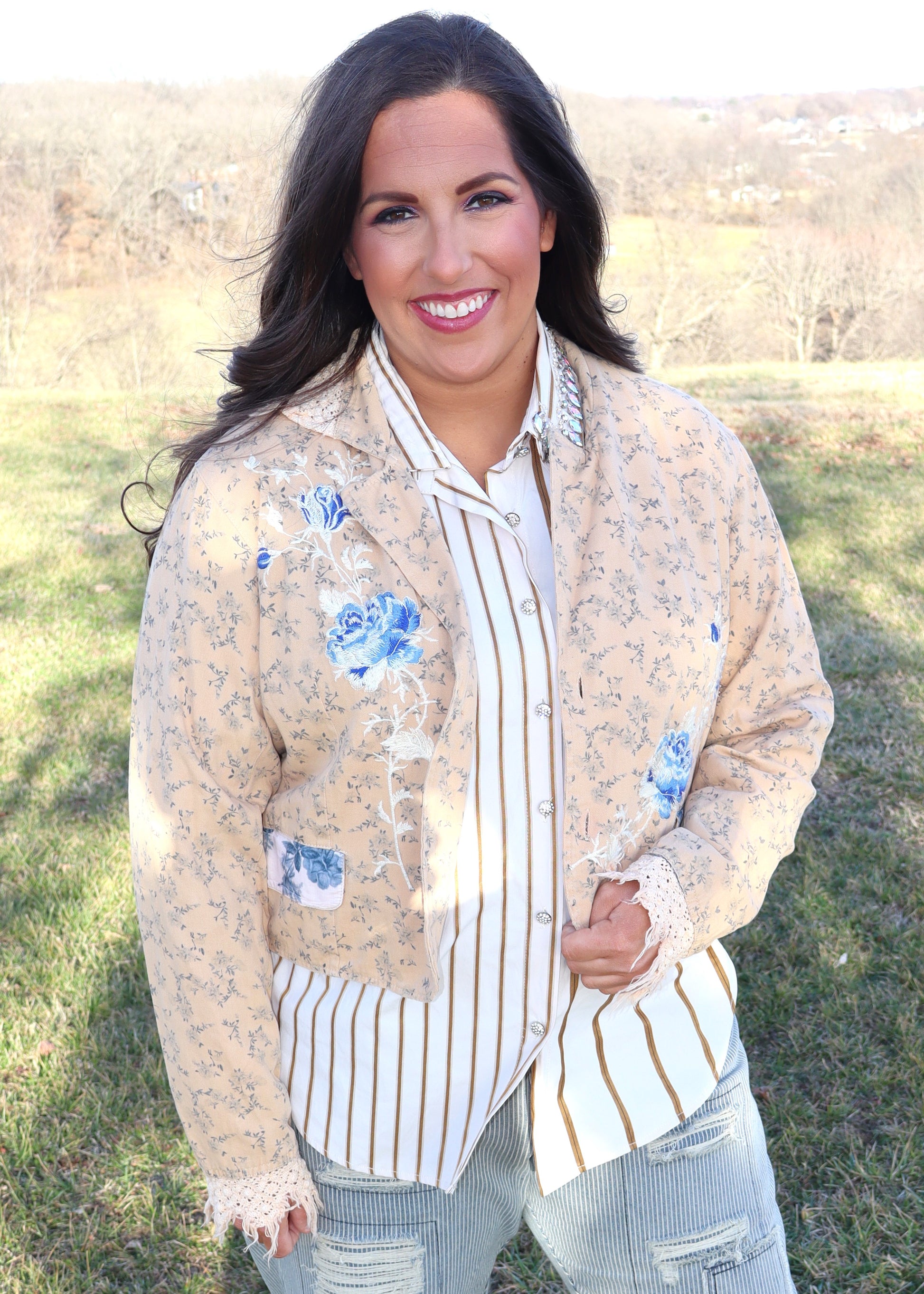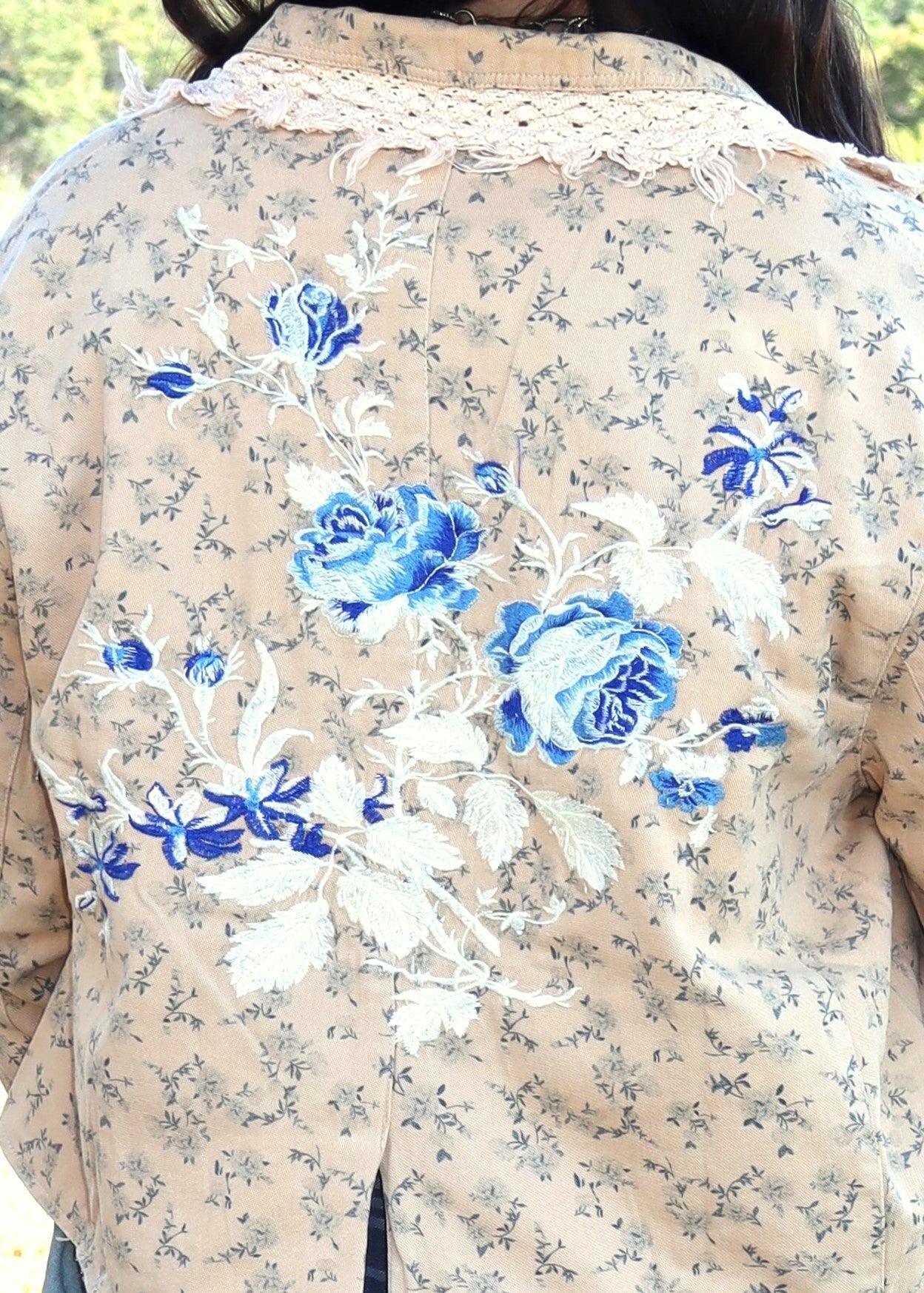 This intricate details in this jacket will be the reason you wear it over and over again for years to come! It has a beautiful subtle blue floral pattern throughout (including on the liner), blue and cream embroidered flowers on the front and back of the jacket, and a cream lace detail on the cuffs.