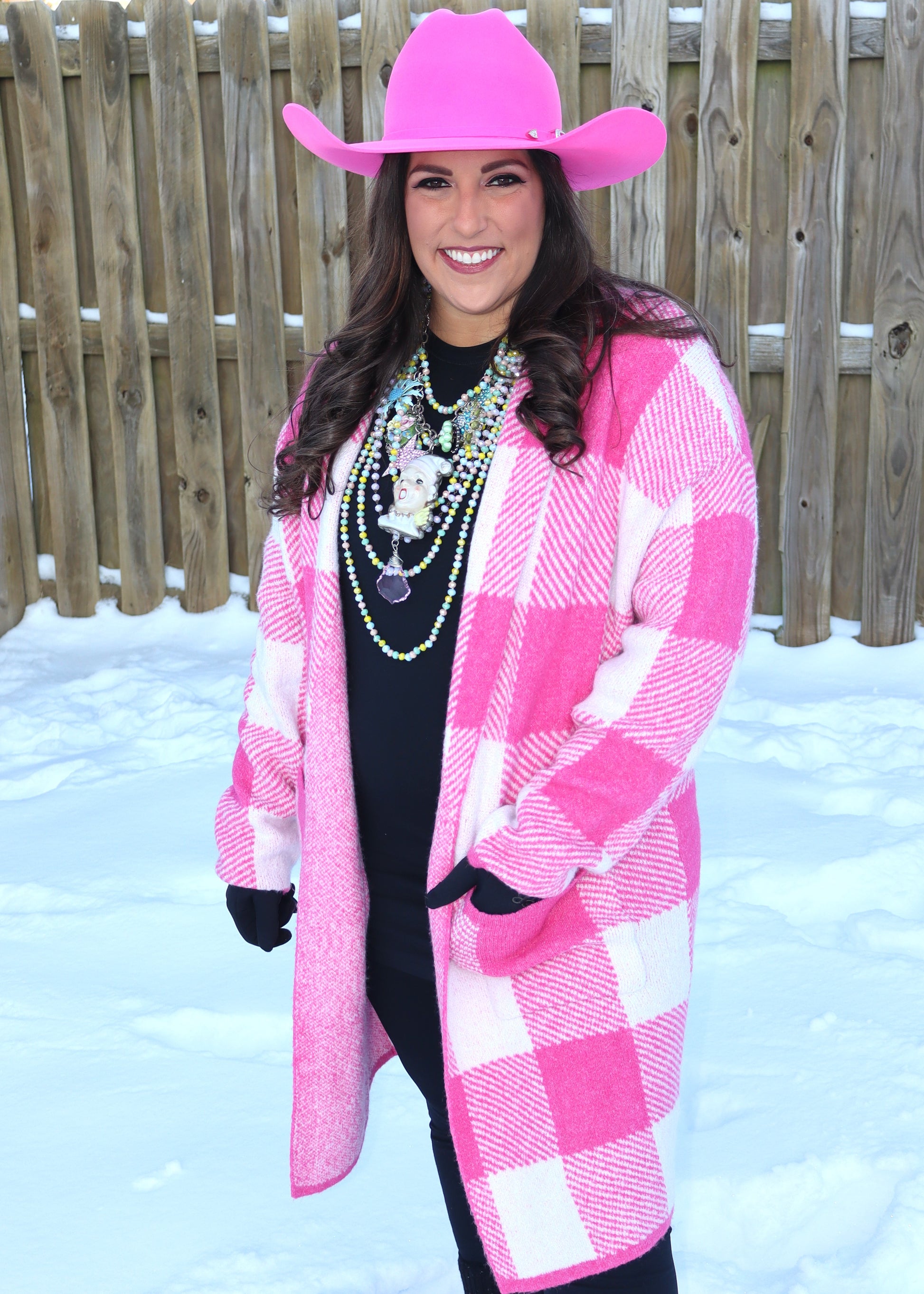 Gingham Pattern Soft Pocket Front Open Cardigan Sweater - Pink